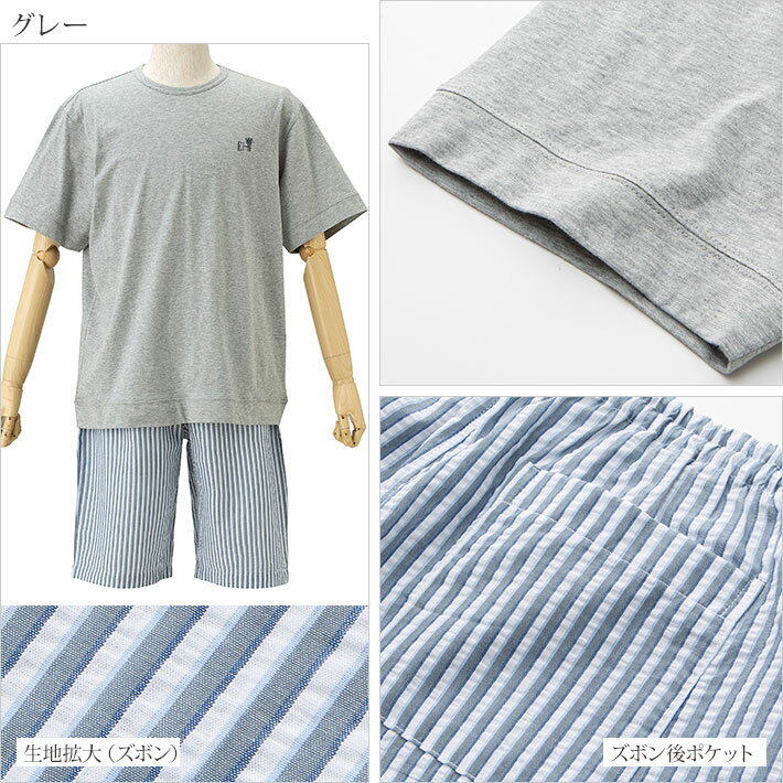 SIZE GUIDE> 詳しいサイズ表記はこちら Mサイズ Lサイズ ヌード寸(cm) チェスト (バスト)88〜96身長 165〜175ウエスト 76〜84 チェスト (バスト)96〜104身長 175〜185ウエスト 84〜94 平置き実寸(cm) トップ:プルオーバー、半袖 ■トップ 着丈:約70肩幅:約49チェスト(バスト):約110.2袖丈:約24.5 ■トップ 着丈:約74肩幅:約51チェスト(バスト):約116.2袖丈:約25.5 ボトム:5分丈 ■ボトム ズボン丈:約56ヒップ:約110ウエストゴム上がり:約70股上:約29 ■ボトム ズボン丈:約58.5ヒップ:約116ウエストゴム上がり:約75股上:約30 この商品の詳細 素材 綿100% (天竺無地/先染めサッカーストライプ) 原産国 中国 生地の伸縮 上衣:伸縮性はあります。