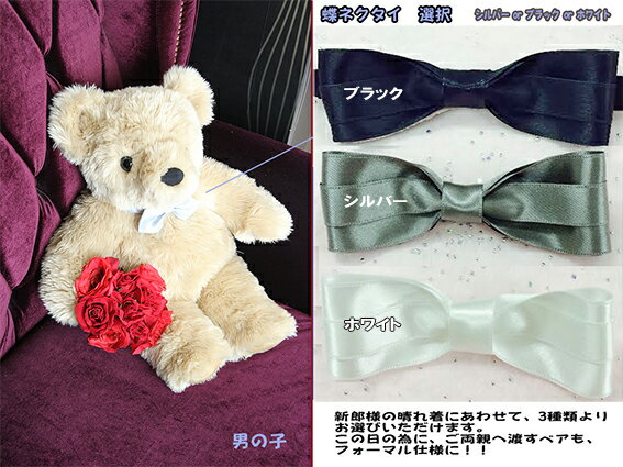 フォーマルな装いのウェイトベア ワンランク上、こだわりの体重ベア ●男の子ベア---テーラードカラーベスト ・ラメ入りサテン布地(シルバーグレー系) ・蝶ネクタイ(シルバー・ブラック・ホワイト) ※ネクタイの形状は若干異なる場合がございます。