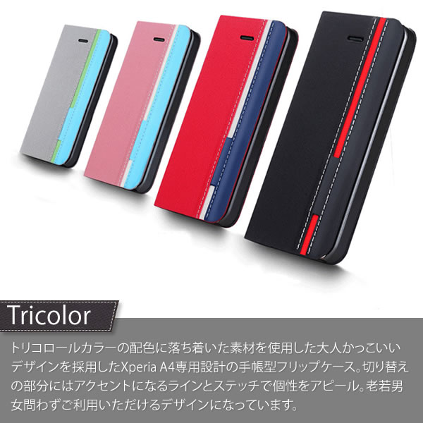 ラッピング ギフト商品名称Xperia A4トリコロールカラー手帳型フリップケース適応機種Xperia A4 SO-04G カラー ブラック ピンク グレー レッド素材PUレザー商品説明トリコロールカラーの配色に落ち着いた素材を使用した大人かっこいいデザインを採用したXperia A4専用設計の手帳型フリップケース。